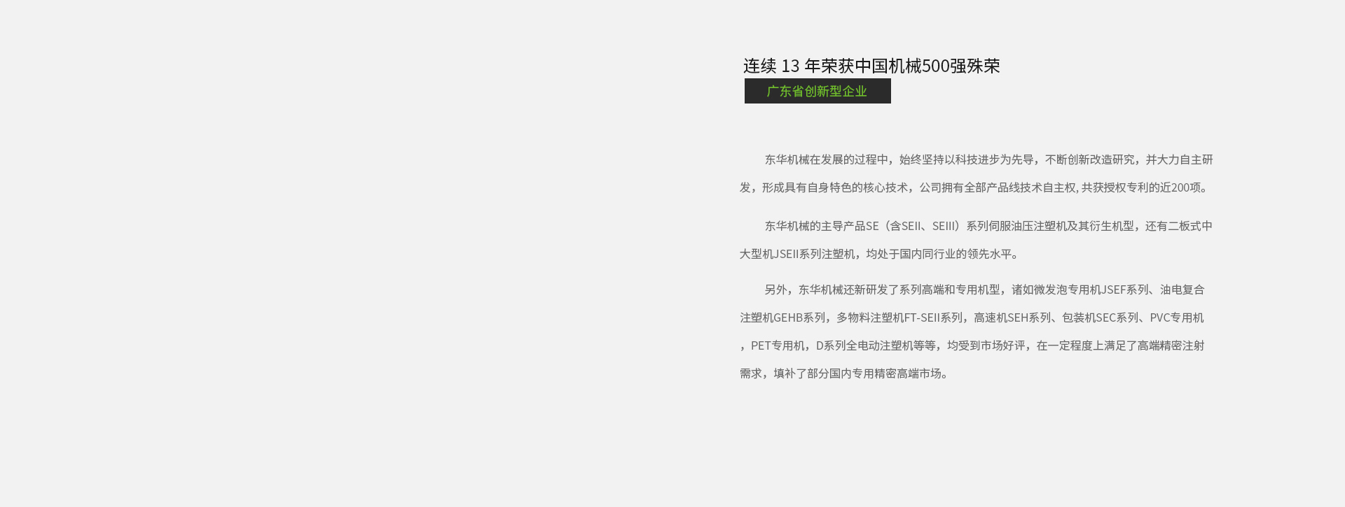2005年,榮獲“中國機(jī)械500強(qiáng)”稱號,“中國橡塑機(jī)械10強(qiáng)”稱號,2007年,東華注塑機(jī)榮獲“中國名牌產(chǎn)品”稱號。2010年,東華的Se系列機(jī)型是全行業(yè)唯一在超大型注塑機(jī)(鎖模力>2,000T)獲得1級節(jié)能評級的企業(yè)。2013年,東華機(jī)械3350JSe通過一級節(jié)能標(biāo)準(zhǔn),成為業(yè)內(nèi)首個3000T-4000T機(jī)型達(dá)到1級節(jié)能標(biāo)準(zhǔn)的注塑機(jī)生產(chǎn)廠家。2014年榮獲“廣東省創(chuàng)新型企業(yè)”,2017年榮獲“國家知識產(chǎn)權(quán)優(yōu)勢企業(yè)”稱號,并已連續(xù)13年榮獲中國機(jī)械500強(qiáng)殊榮。2022年東華機(jī)械獲評“第二批廣東省智能制造生態(tài)合作伙伴”稱號,2023年1月,東華入選2022年度“廣東省專精特新中小企業(yè)”。