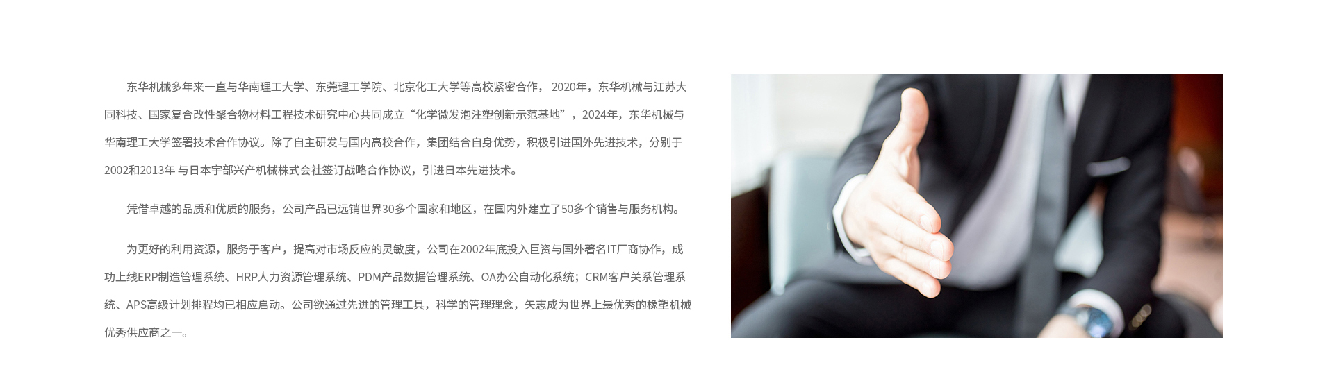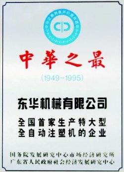 1993年東華公司在國內(nèi)首先突破特大型注塑機(jī)的設(shè)計和工藝技術(shù),成功設(shè)計制造出國內(nèi)首臺2500噸合模力的TTI-2500B特大型注塑機(jī),填補(bǔ)了我國大型注塑機(jī)的空白,獲得了國務(wù)院頒發(fā)的“中華之最”榮譽證書;同年在國內(nèi)塑機(jī)行業(yè)首家獲得高新技術(shù)企業(yè)認(rèn)定證書和ISO9001質(zhì)量體系認(rèn)證證書; 2001年研制出國內(nèi)第一臺環(huán)保節(jié)能高效的電動注塑機(jī);2004年,被廣東省科技廳評為優(yōu)秀高新技術(shù)企業(yè)。